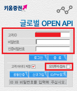 - 모의계좌 로그인시 홈페이지 아이디/비밀번호, 계좌/계좌비밀번호의 4가지가 필요하다.