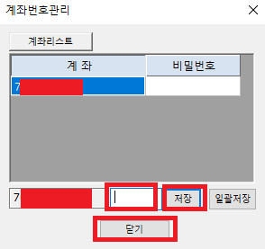 위의 코드는 키움증권에서 제공하는 GetComminFunc를 통해 계좌로그인을 한다. 아래 < 그림3 >은 모의계좌이며, 하단에 계좌비밀번호 4자리를 입력-저장-닫기를 하면 로그인이 완료된다.