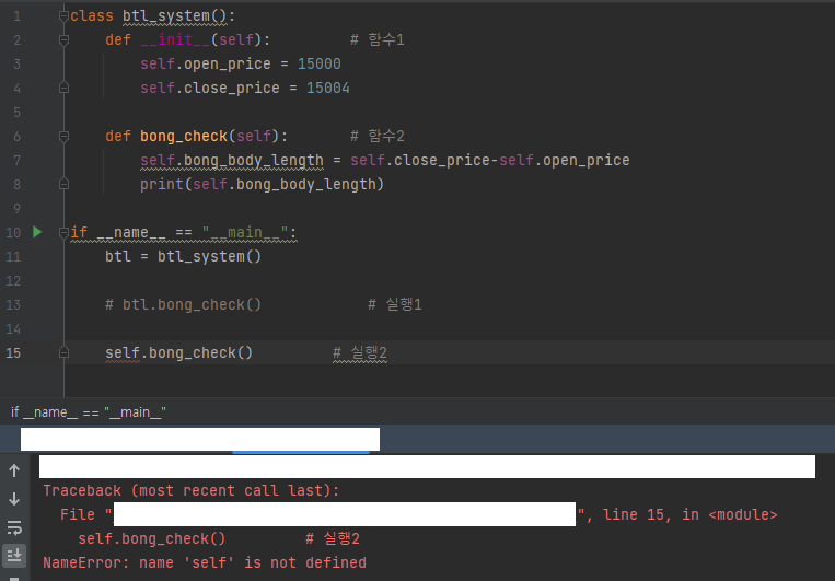 클래스 인스턴스 형태로 활용하지 않은 경우, 15줄(실행2)의 self를 10줄~15줄에서 정의(define)하지 않아 오류가 발생한다.