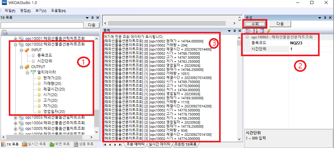 < 그림1 >을 자세히 확인하자. WKOAStudio에서 자료를 받아오는 방법은 ①tr목록을 먼저 확인하고, ②종목코드/시간단위를 입력/조회하면, 화면중앙 ③에 데이터가 출력된다.