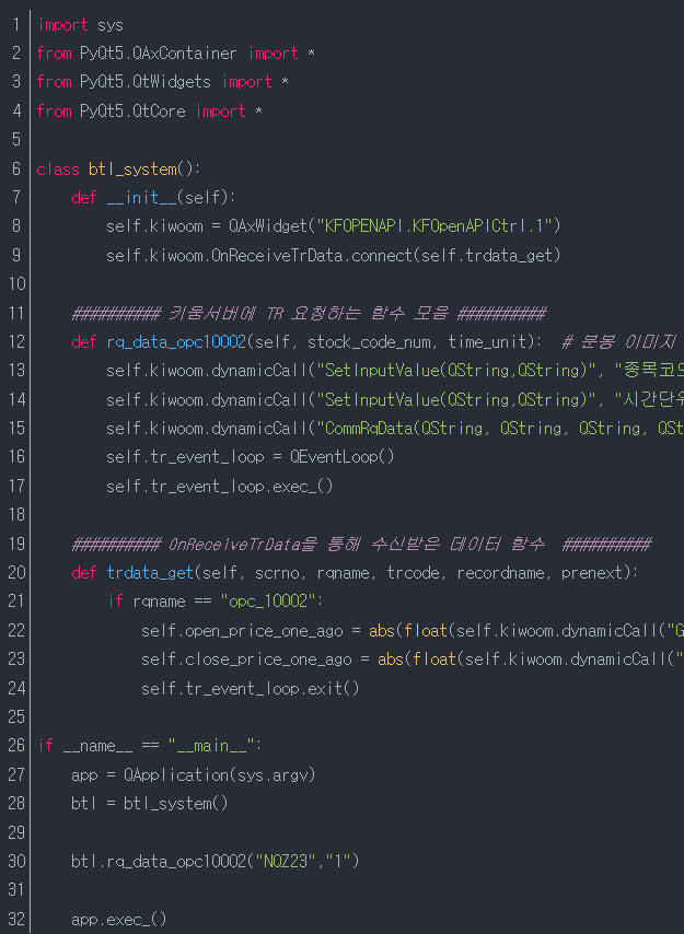 21줄 : 이글의 두번째 핵심이다. 9줄의 OnReceiveTrData.connect를 통해 15줄(CommRqData)와 20줄(trdata_get)을 연결하였다. 즉 15줄에서 데이터를 요청하면 9줄의 연결을 통해 20줄을 통해 1분봉의 시가/종가를 수신받을 수 있는 것이다.