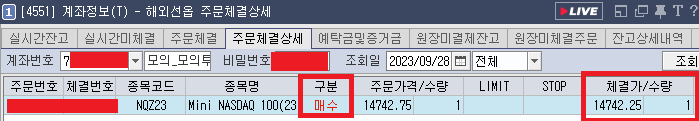 먼저 임의로 모의계좌에서 long으로 1계약 진입하였다. (체결 가격 14742.25)