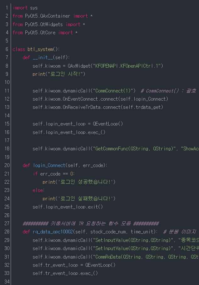 1줄~34줄 : 로그인 및 opc10002(1분봉 데이터 받기)에 대한 내용으로 설명을 생략한다.