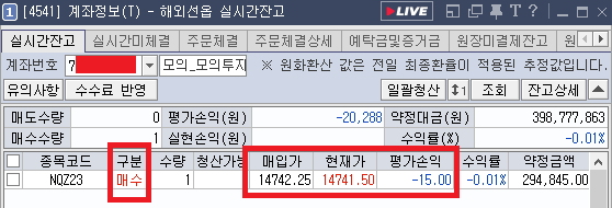 < 그림 1-3 >에서 < 그림 1-2 >의 내용을 확인할 수 있다. 매입가격(체결가격)은 14742.25, 현재가격 14741.50으로 동일하고 평가손익도 1500이다. (물론 평가손익은 나중에 100으로 나누어주어야 한다)