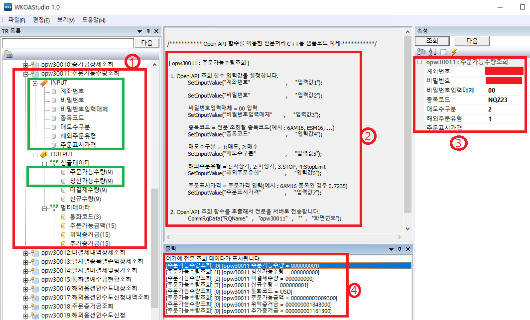 < 그림 2 >는 WKOA Studio에서 opw30011(주문가능수량 조회)를 실행한 결과이다.