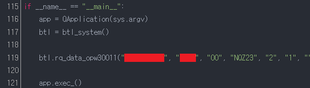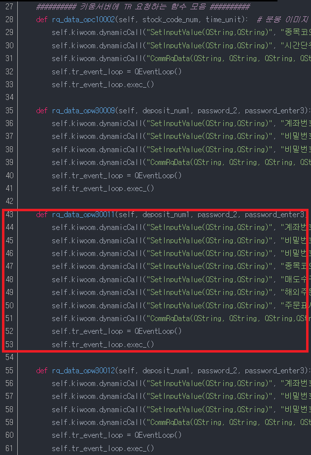 51줄 : 44줄~50줄에서 입력된 7가지 input 데이터를 OpenAPI-W에 요청(CommRqData)한다.