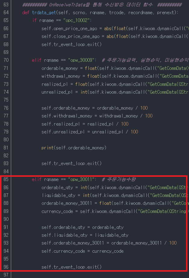 orderable_money_30011 = float(self.kiwoom.dynamicCall("GetCommData(QString,QString,int,QString)", "opw_30011", "opw30011", 0, "주문가능금액").strip())