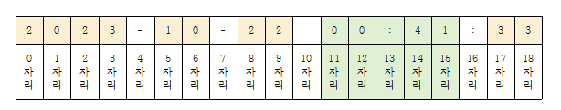 7줄 : 문자형인 now_time1변수(2022-10-22 00:41:33)의 11자리~16자리를 추출한다. 대괄호의 16자리의 콜론(:)은 포함되지 않는다.