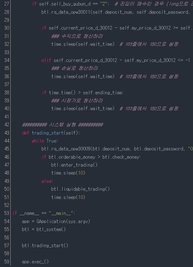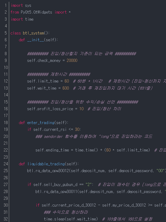 32줄 : 13줄에서 설정한 숫자(600초)에 따라 10분간 대기(time.sleep)한다. (청산후 대기시간 설정)