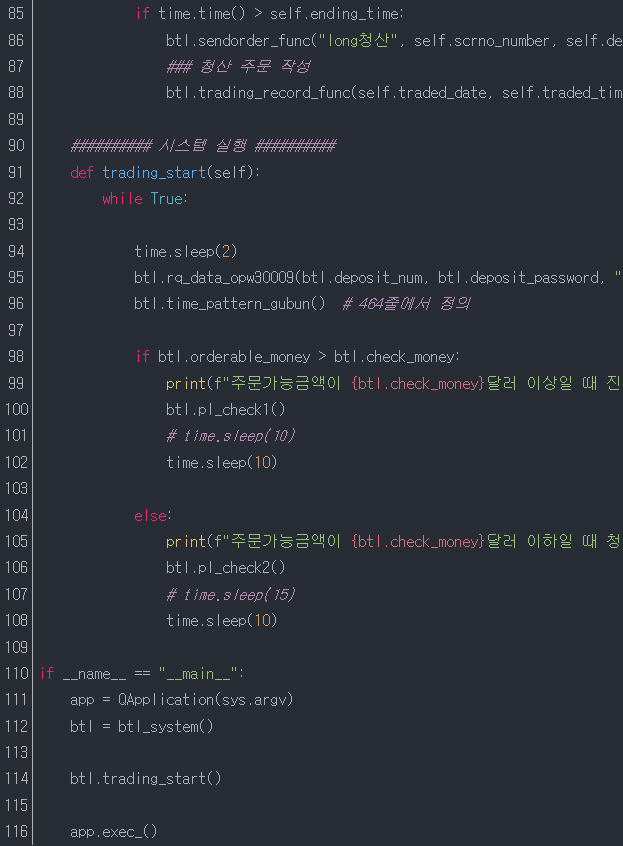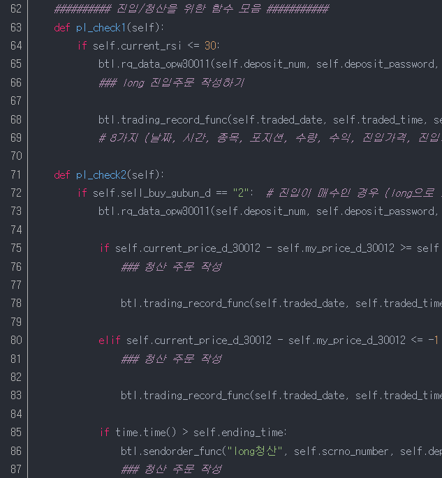 90줄~116줄 : 주문가능수량 및 체크금액(20,000달러)과 비교하여, 진입(pl_check1)함수 및 청산(pl_check2)를 실행유무를 결정되면, 각각의 진입/청산함수를 실행하라