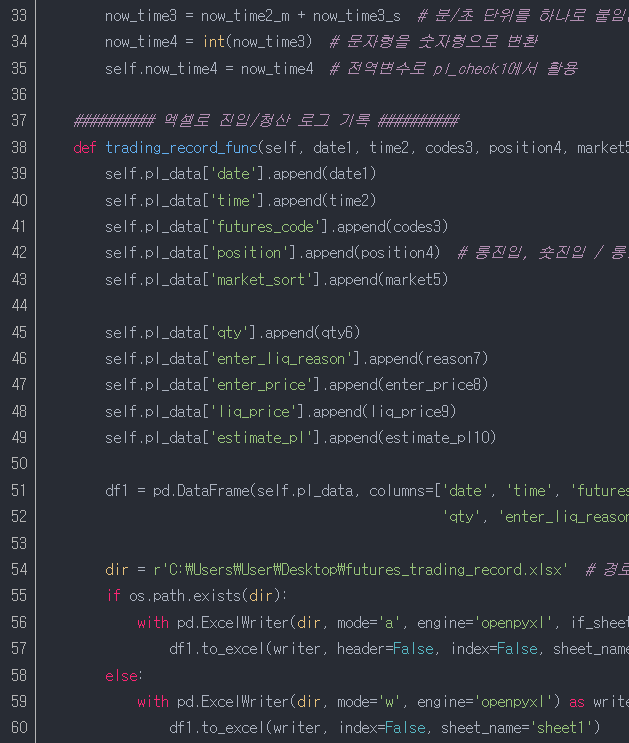 38줄~60줄 : 매매(진입, 청산)가 발생할 때마다 엑셀에 보내는 반복적인 작업을 할 것이므로 함수를 선언해준다.