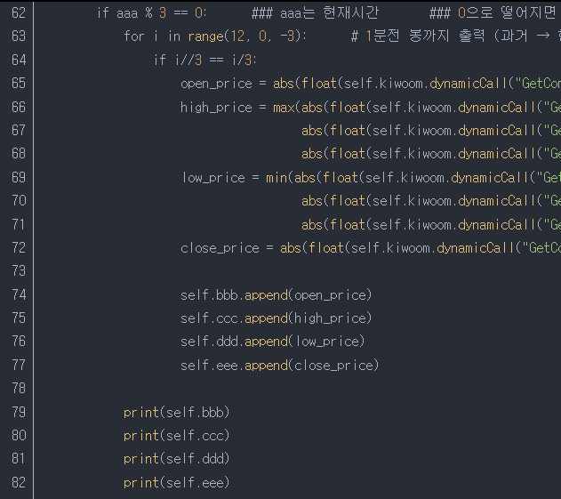 74줄~77줄 : 63줄~68줄에서 구한 3분봉의 데이터를 각각의 리스트에 담는다.