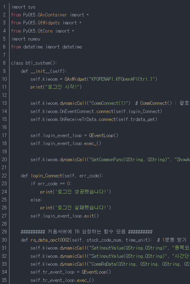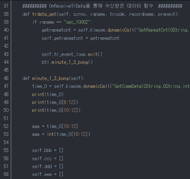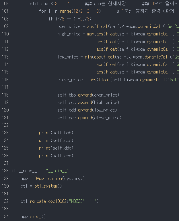28줄~33줄 : 1분봉 데이터를 받기 위해 116줄(btl.rq_data_opc10002)에 의해 실행되는 함수를 정의한다.
