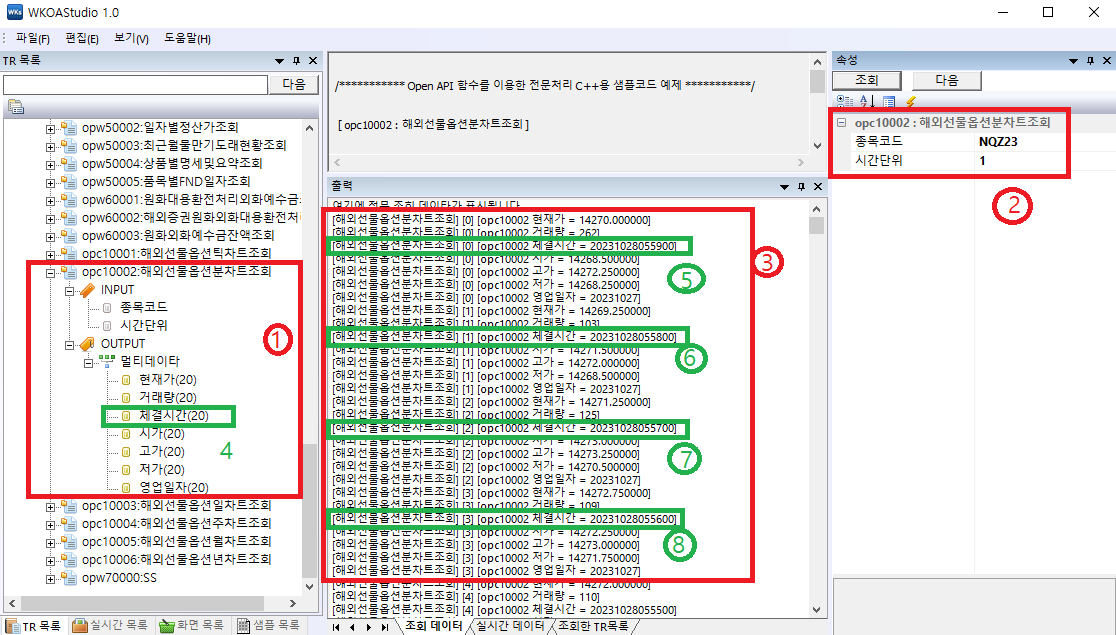 < 그림1 >에서 분차트조회를 통해 TR목록의 결과값(output)으로 체결시간(④)을 얻을 수 있다. WKOA Studio의 TR 목록 중 opc10002(해외선물옵션 분차트조회)를 통해 NQZ23, 1분봉을 조회(②)하였다. 출력창(③)의 내용을 확인해 보자.