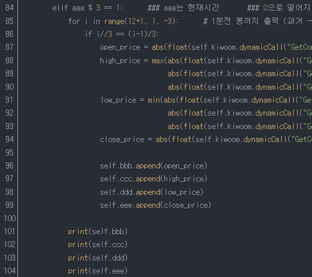 87줄~104줄 : 1분봉 데이터 모음을 통해 3분봉의 데이터 추출한 후 리스트에 넣어서 출력하라.