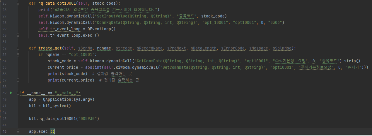 28줄 : dynamicCall 함수을 통해 CommRqdata함수의 opt10001 TR실행을 요청