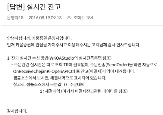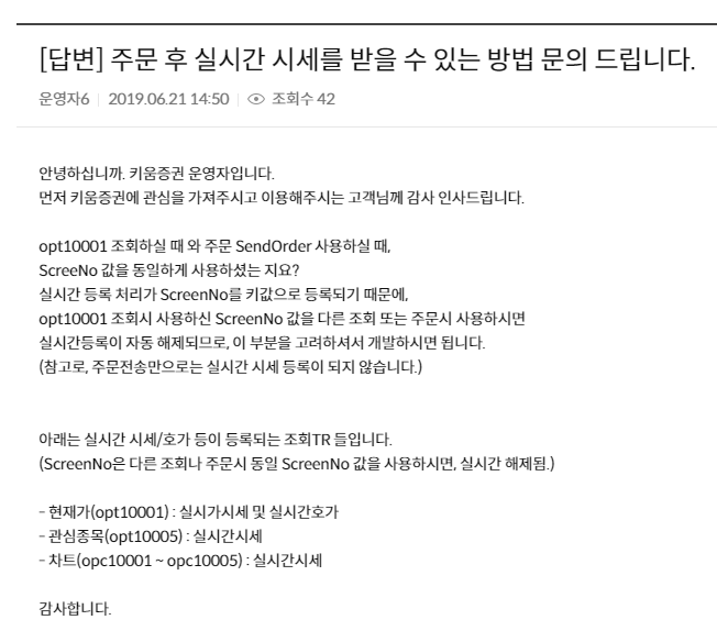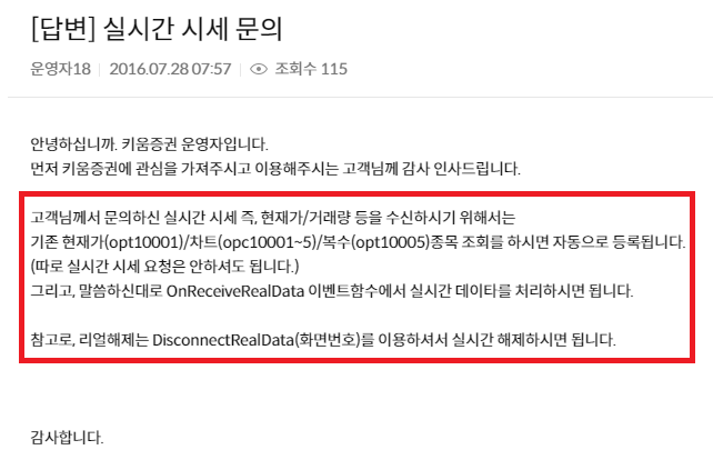 2. 실시간 데이터 받기에 대한 키움측 답변