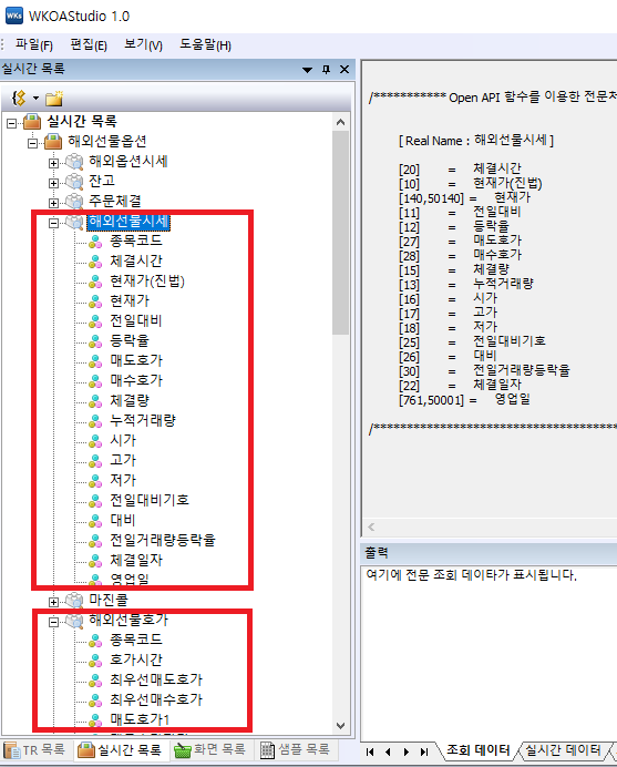 < 그림2 >는 WKOA Studio에 대한 내용이다. 여러 "실시간 목록" 중 필자는 2가지(해외선물시세, 해외선물호가)에 대한 내용만 코드로 구성할 수 있었다. 필자의 실력이 부족해서일까? "잔고"목록을 조회하고 싶었는데, < 그림1-3 >의 설명처럼 잔고목록은 제공하지 않는다고 하니, 어쩔수 없이 포기하였다.