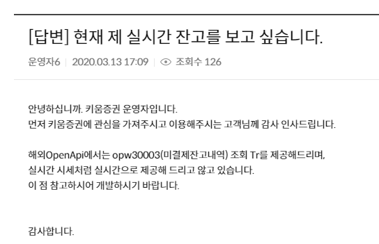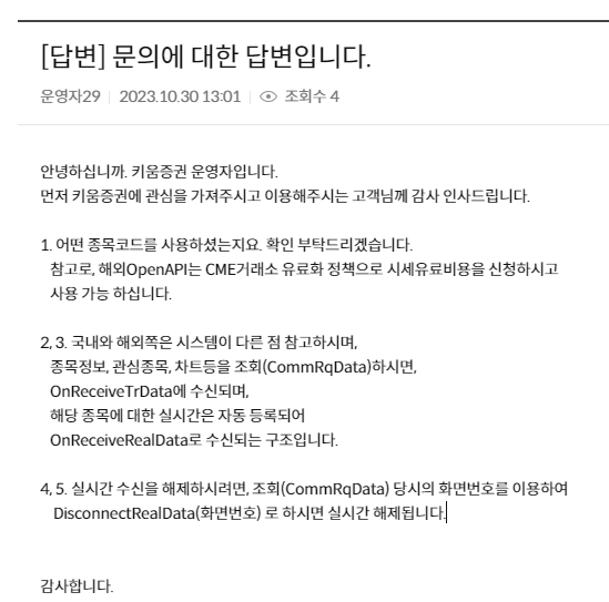 실시간 데이터를 받아오는데, 일부 데이터는 받아올 수 없었다. 필자가 놓치고 있는 내용이 있나, 키움증권의 OpenAPI-W의 게시판에 들어가 보았다. 경로는 키움홈페이지 > 고객서비스 > OpenAPI+ > 해외파생OpenAPI > 해외파생OpenAPI게시판.에서 "실시간"으로 검색하였다.
