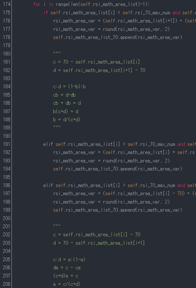 191줄~194줄 : 2분전 rsi 및 1분전 rsi가 각각 70이상인 경우이다. 사다리꼴 넓이를 구한다.