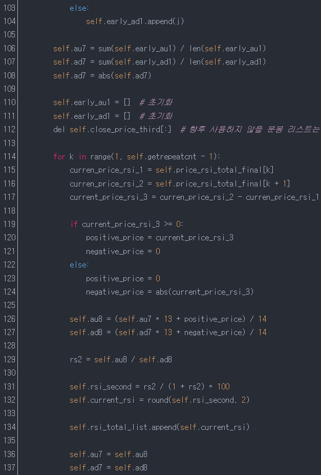 74줄~102줄 : rsi 구하는 방법이며 맨 앞의 링크에서 설명하였으므로, 여기서는 설명을 생략한다.