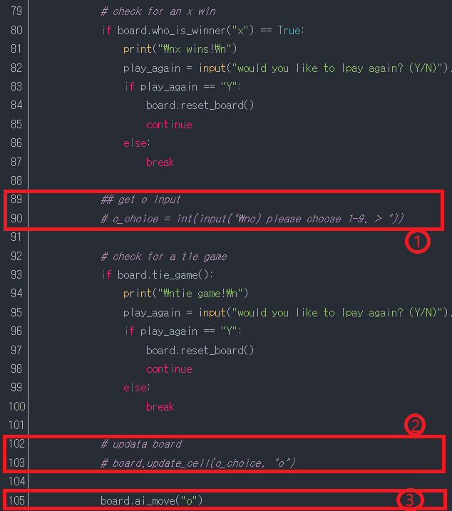 89줄~90줄 : 수동으로 데이터를 입력한 o플레이어의 "입력 코드"를 주석처리한다.