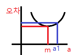 경사하강법은 y = ax^2 (아래로 볼록)한 이차 함수에서 기울기가 0 혹은 최소인 m을 학습을 통해 찾는 방법이다. < 그림1 >에서 a1의 오차보다 m의 오차가 작은 것을 확인할 수 있다.