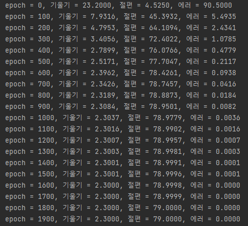 파이참의 결과창에 나타난 값은 아래와 같다. epoch(반복횟수)가 증가할수록 기울기, y절편이 2.3 및 79로 수렴하는 것을 알 수 있다. 또한 에러는 0으로 수렴한다.