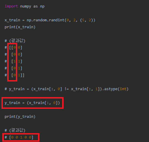 y_train = (x_train[:, 0] != x_train[:, 1]) 코드를 천천히 분석해보자. 어렵다. ㅠ