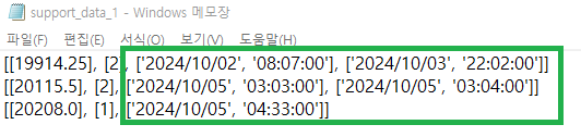 # print(read_raw_text) # ["[[19914.25], [2], ['2024/10/02', '08:07:00'], ['2024/10/03', '22:02:00']]\n", "[[20115.5], [2], ['2024/10/05', '03:03:00'], ['2024/10/05', '03:04:00']]\n", "[[20208.0], [2], ['2024/10/05', '04:33:00'], ['2024/10/05', '05:34:00']]\n"]