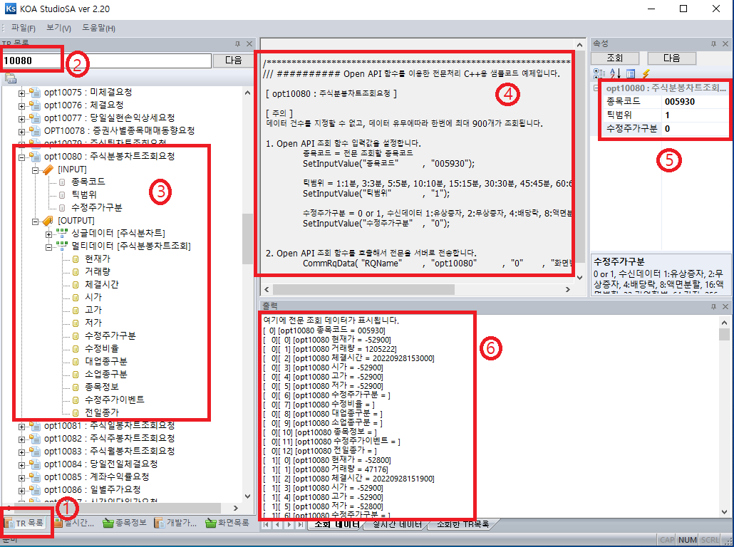 ③ opt10080에서는 INPUT은 3가지(종목코드, 틱단위, 수정주가구분)를 입력한다.