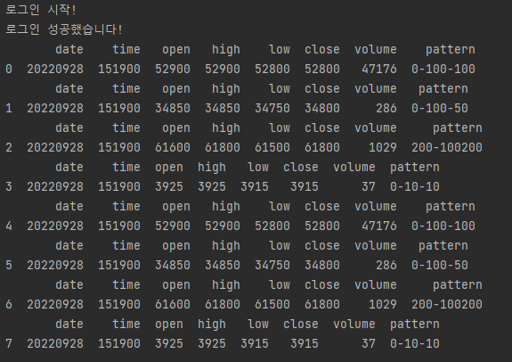 - 받아온 1분봉을 데이터프레임에 담아 출력한다.