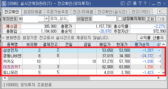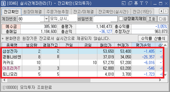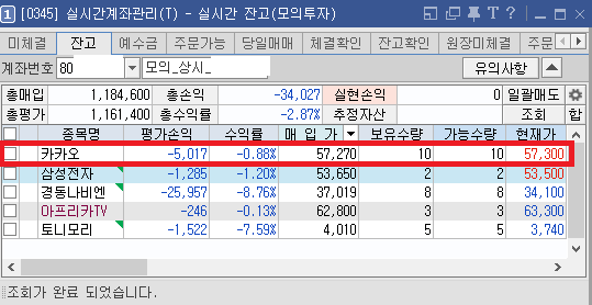 그림3-2는 위의 함수를 실행하여 카카오 10주를 매수한 후의 화면이다.