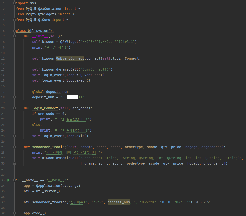 함수를 만들 때(27줄)는 키움 KOA Studio에서 안내한대로 함수를 작성하되,