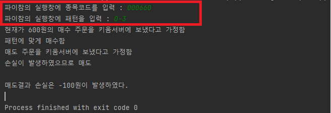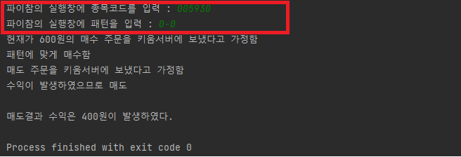 input 함수에서 종목코드와 패턴값을 임의로 입력한다.