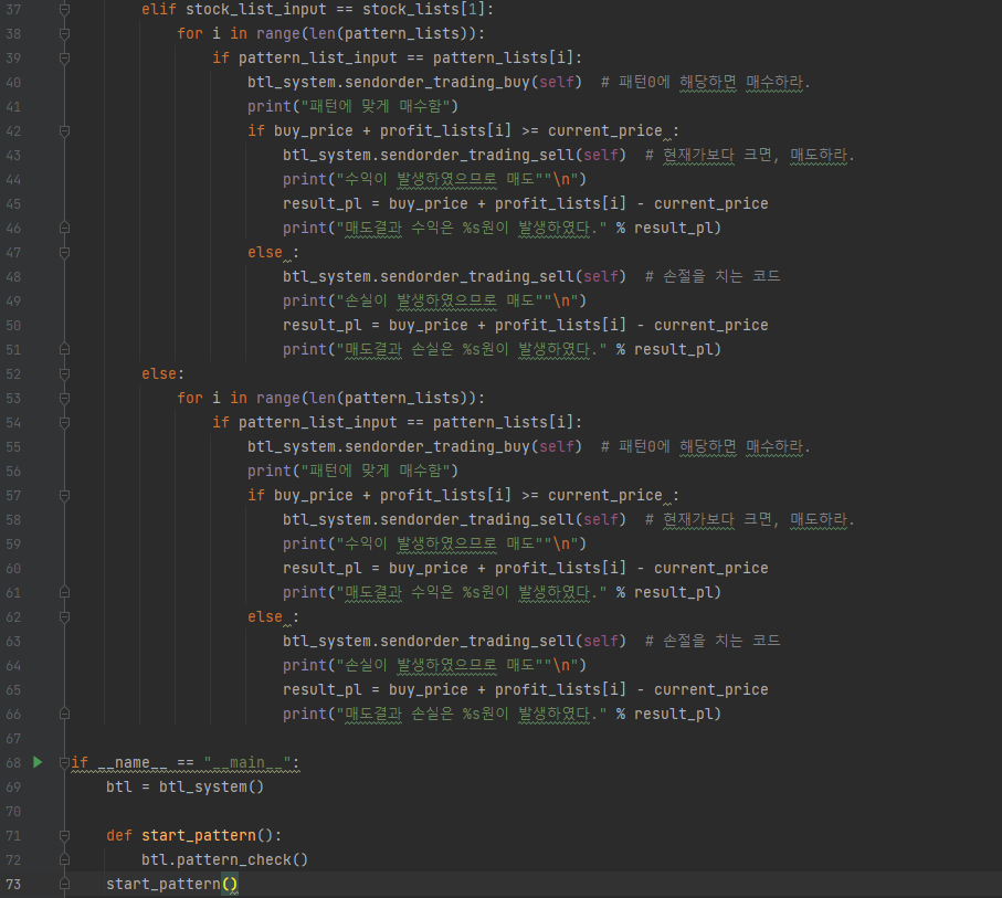 38줄~51줄 : for을 돌려 같은 패턴이 있으면, 익절/손절을 하라.