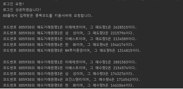 59줄 : 수신받은 코드번호(stock_code_num), 매도가 가장 많았던 매도거래원명1, 그 매도량을 출력한다.