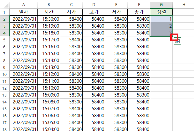 G열에 1, 2, 3을 써주고, 아래 <그림2-2>의 빨간색으로 둔 부분에 마우스를 올려두면,