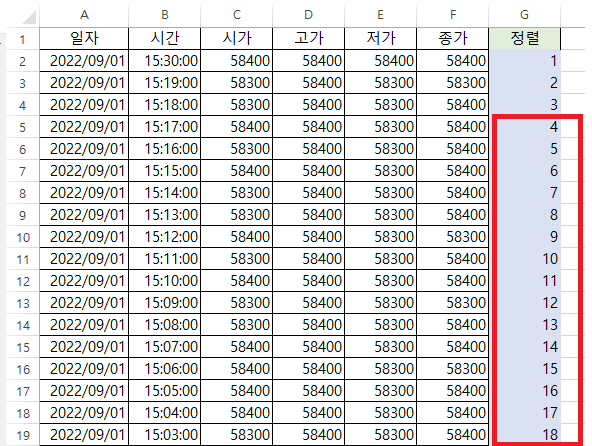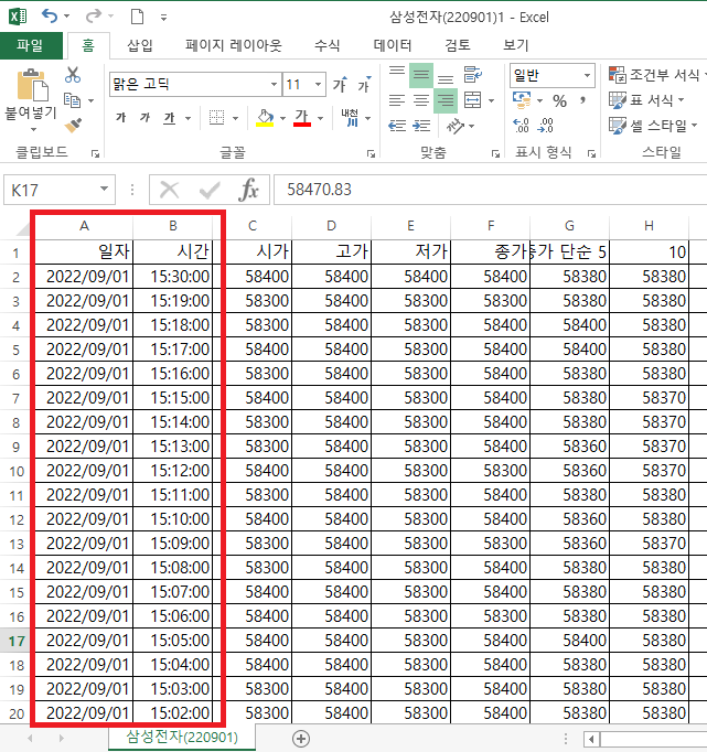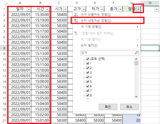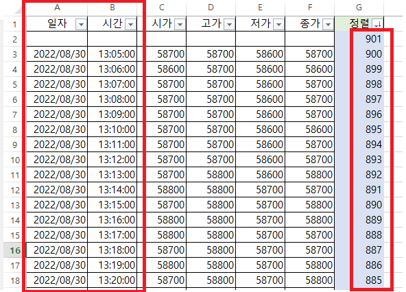 A열(날짜), B열(시간)이 오름차순으로 된 것을 확인할 수 있다.