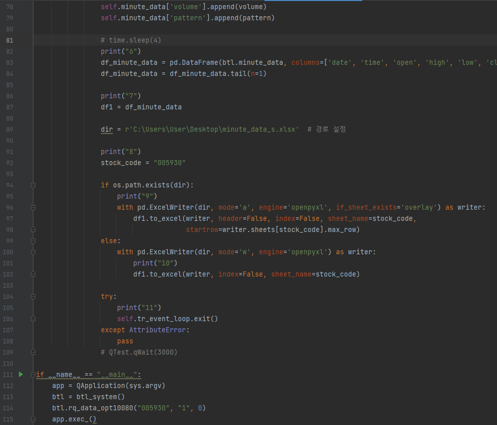 83줄 : 72줄~79줄에서 업데이트한 22줄의 self.minute_data를 pandas의 DataFrame에 넣는다.