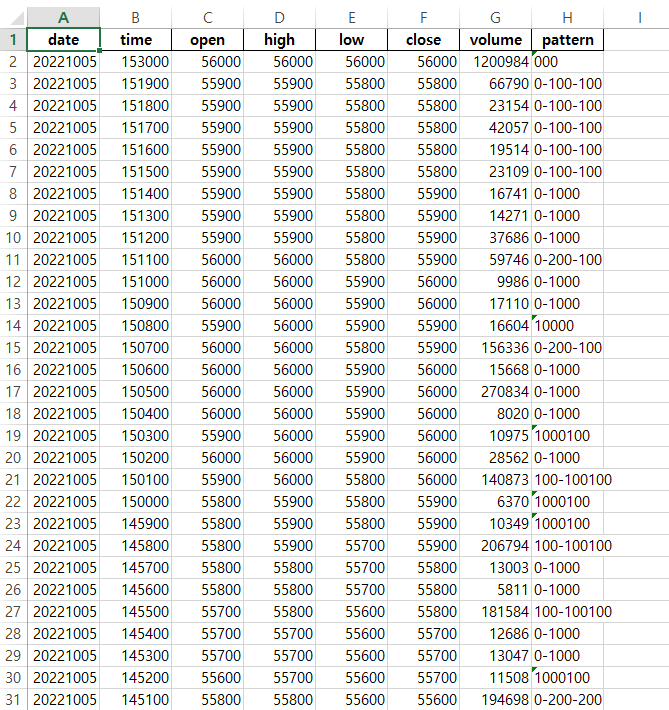 df_minute_data = pd.DataFrame(btl.minute_data, columns=['date', 'time', 'open', 'high', 'low', 'close', 'volume', 'pattern'])