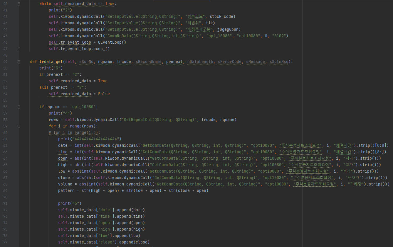 49줄 : trdata_get 함수를 임의로 만들어, 31줄~47줄에서 입력/요청한 데이터를 받아온다.