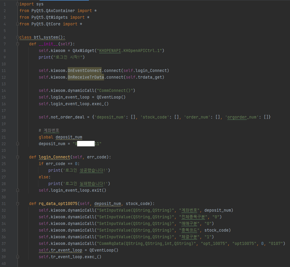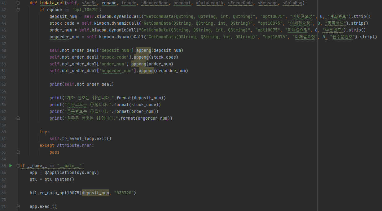 69줄 : 계좌번호(deposit_num)와 코드번호(stock_code) 담아서 31줄의 rq_data_opt10075함수를 실행하라