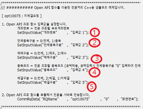 - INPUT은 5개 인수의 입력 설명(계좌번호, 전체종목구분, 매매구분, 종목코드, 체결구분) (②, ③)