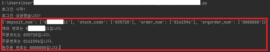 55줄 ~ 58줄 : 4개 변수를 출력하라 (계좌번호, 주문코드, 주문번호, 원주문번호)