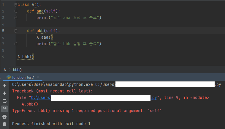 - 다만, 6번줄에서 에러가 났다. 오류 메시지도 aaa() missing 1 required position argument:self 이다.