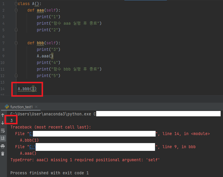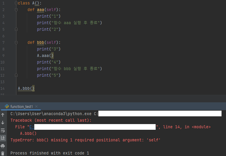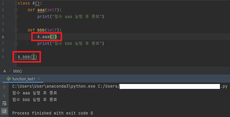 - <코드1> 은 클래스 A안에 있는 bbb함수를 실행하면, aaa함수가 실행되는 내용이다.(아래는 실행하면 오류가 난다)