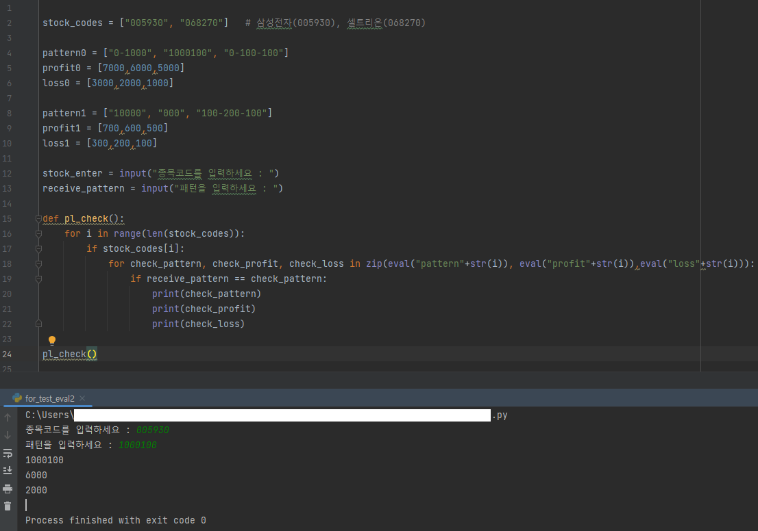 for check_pattern, check_profit, check_loss in zip(eval("pattern"+str(i)), eval("profit"+str(i)),eval("loss"+str(i))):