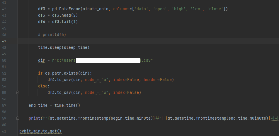 61줄 : 임의로 선언한 13줄 bybit_minute_get 함수를 실행하라