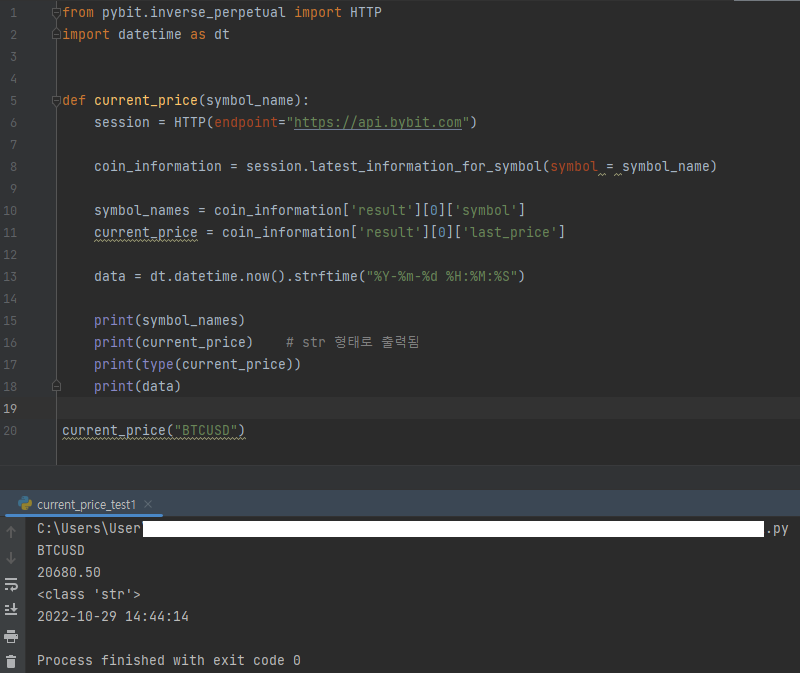 20줄 : 5줄의 current_price 함수에 "BTCUSD"를 넣어서 실행해준다.